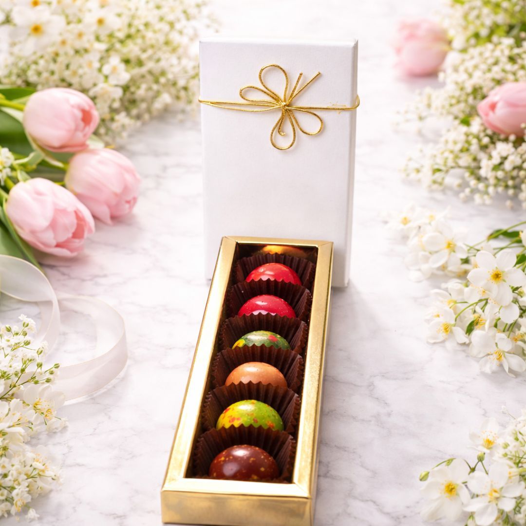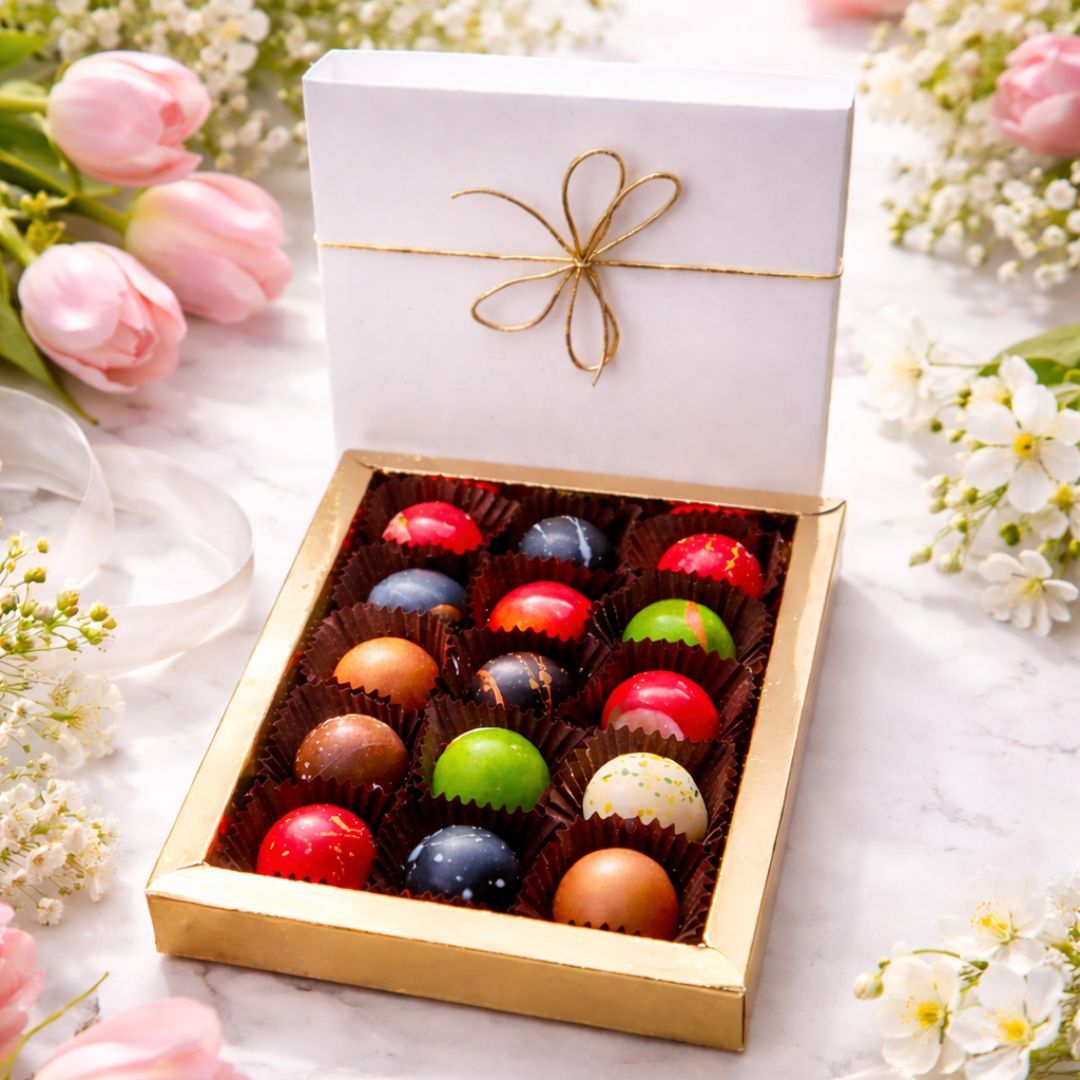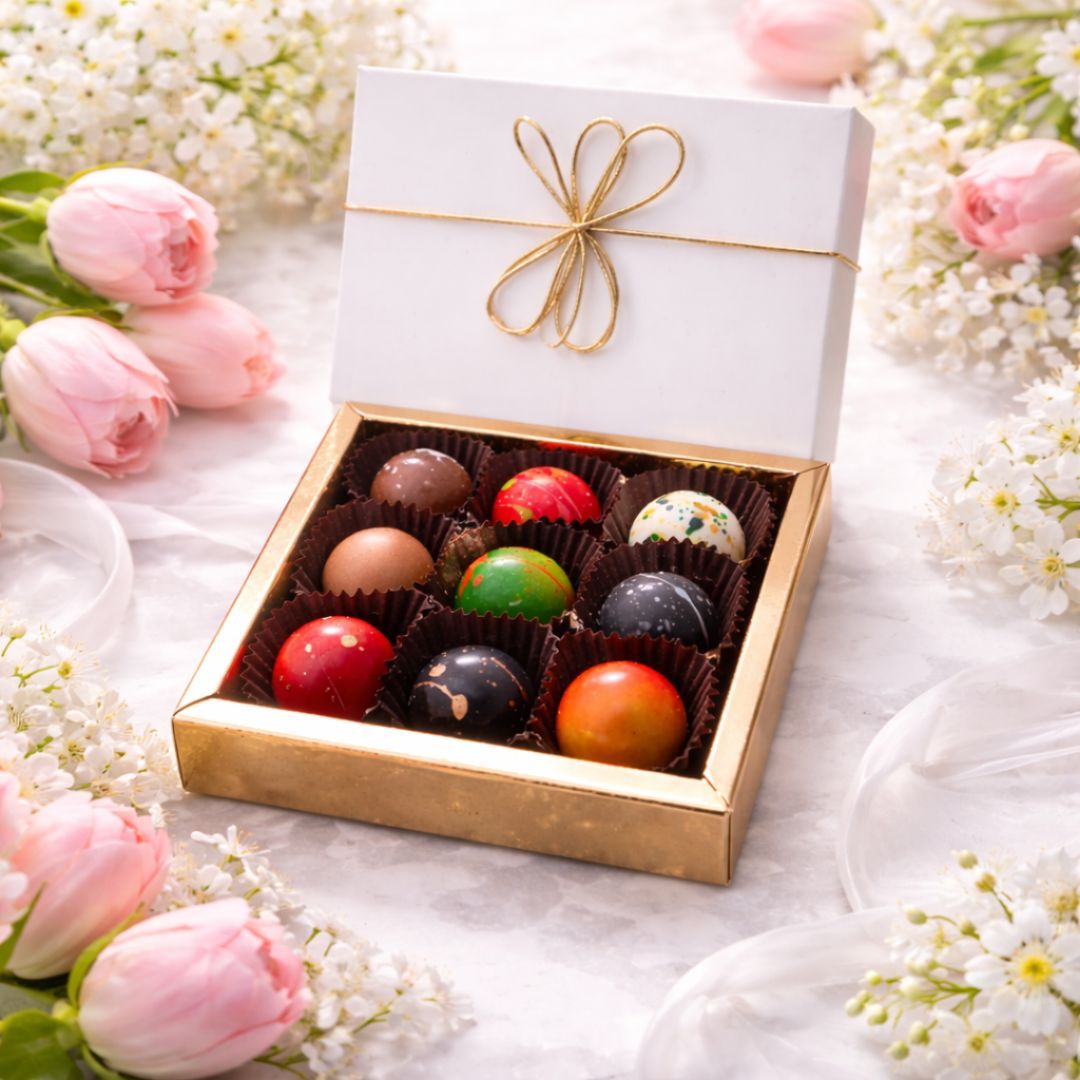 Każda sztuka to małe dzieło sztuki – wypełnione aksamitnym ganache, praliną orzechową, owocowym musem lub karmelowym sercem.