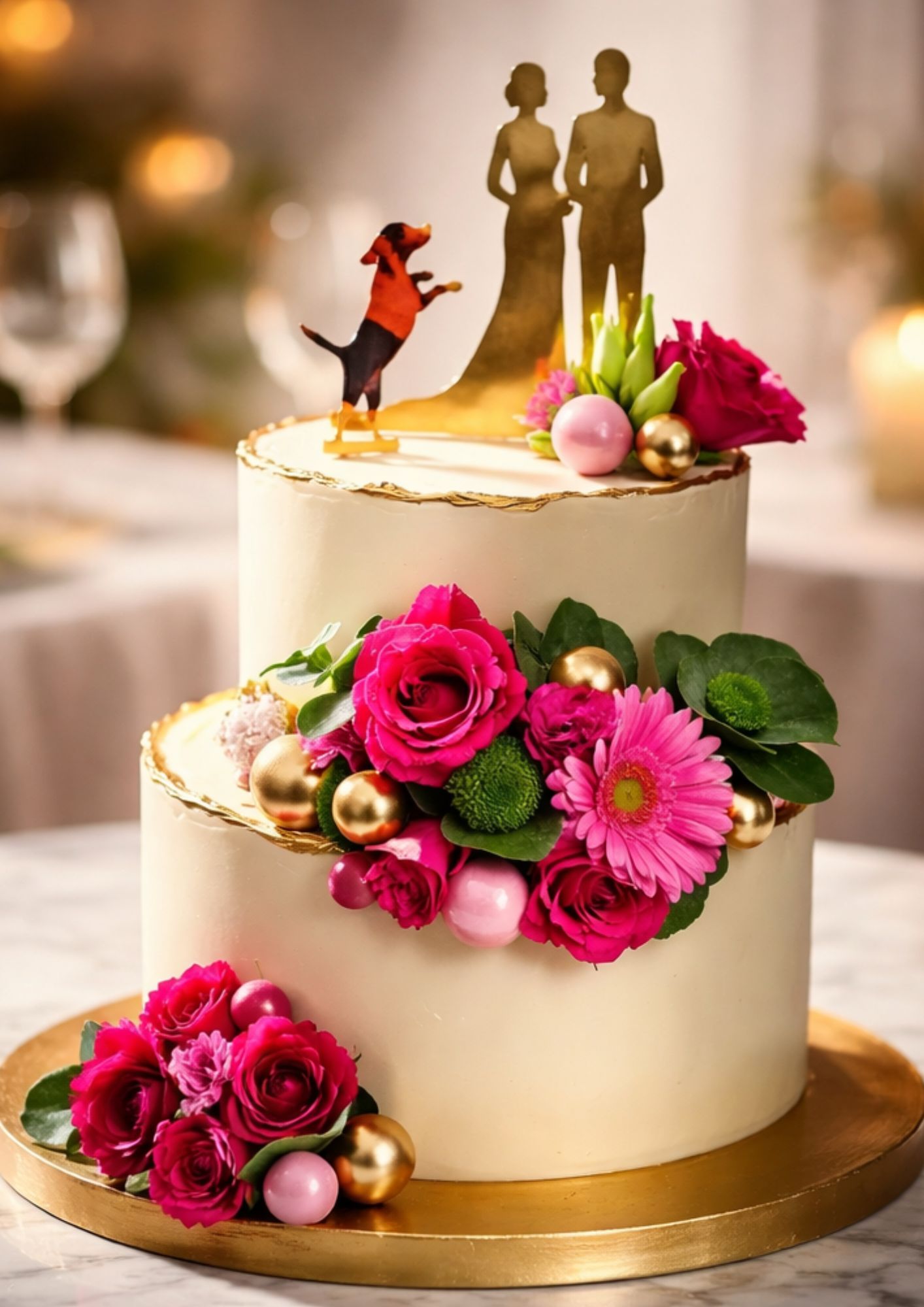 eleganckie dekoracje z masy cukrowej, kremu, czekolady i żywych kwiatów